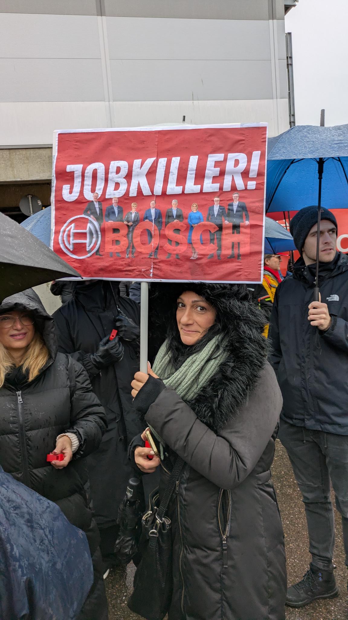 Viele kamen in Bussen von anderen Standorten angereist. Aber auch Kolleginnen und Kollegen aus anderen Betrieben solidarisierten sich. Angesichts der angekündigten und zum Teil schon erfolgten 22.000 Jobs, die gestrichen werden, haben viele verstanden, dass man zusammenhalten muss. Statt Standortlogik und entsprechender Konkurrenz untereinander, ist klar, dass man dringend Solidarität braucht.