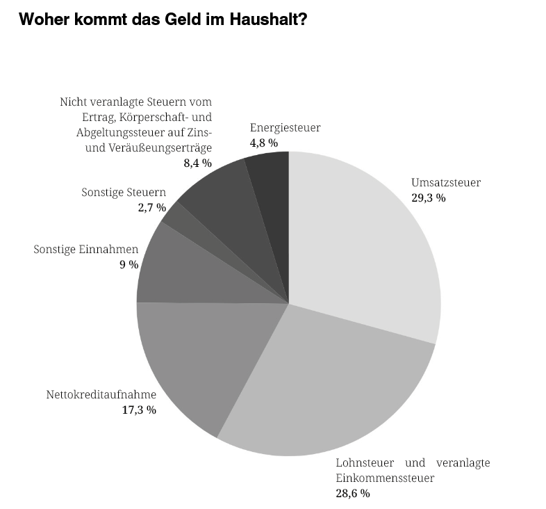 Mit rund 197 Milliarden Euro bleibt der Etat für Arbeit und Soziales der größte Einzelposten im Haushalt – zumindest auf Papier, wenn wir die Tricksereien rund um die Gelder für die Aufrüstung betrachten, liegt dieser davon nicht mehr weit entfernt. Das Hochhalten jenes roten Balkens dient nicht zuletzt dazu die Zustimmung der Bevölkerung zu stabilisieren und wird nicht selten als Beleg für den Sozialstaat genutzt. Es ist dieser Balken, der uns den Eindruck eines handlungsfähigen Staates vermitteln soll, der in der Lage ist, all die Herausforderungen der heutigen Zeit zu meistern: Demokratie schützen, Verteidigungsfähigkeit ausbauen und gleichzeitig steigt sogar der Mindestlohn auf 13,90 € – wozu also beschweren? „Wir gehen verantwortungsbewusst mit den Geldern der Bürgerinnen und Bürger um.“ – heißt es in der Pressemitteilung des Bundesministeriums der Finanzen. Doch so ist es die Arbeiterklasse, die diesen Rüstungswahn von vorne bis hinten finanziert: Sie schafft durch Steuerabgaben erst die Gelder, wird dadurch für die Interessen des Kapitals faktisch enteignet und bekommt Kürzungen und Sozialabbau zurück, damit die Schulden und die Zinstilgung abbezahlt werden können. Denn laut dem Finanzbericht des Bundes stammt der Großteil der Haushaltsgelder aus der Lohn- und Umsatzsteuer (siehe Abbildung) und wird damit im Verhältnis zum Kapital überproportional von der Arbeiterklasse selbst gestemmt. Die Staatsverschuldung in Deutschland liegt bereits jetzt nicht zuletzt aufgrund der Sondervermögen bei ca. 2,55 Billionen Euro. Allein die Zinskosten betragen in diesem Jahr etwa 30 bis 34 Milliarden Euro und sollen sich in kurzer Zeit bis 2029 auf 66 Milliarden Euro jährlich faktisch verdoppeln. Und so sind es diese Gelder, durch die der Etat immer tiefer ausgehungert wird