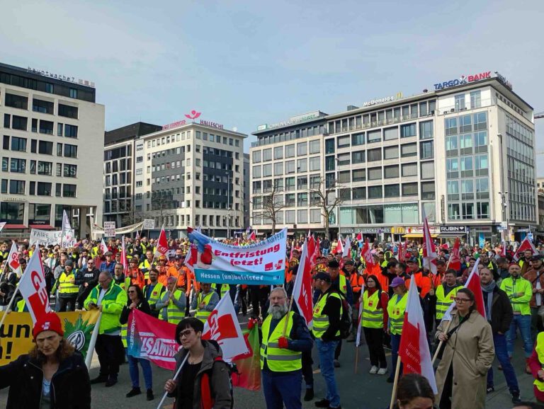 Am Samstag den 21.03 gab es in Frankfurt schon eine Aktion zu den Kürzungen, bei der sich etwa 1500 Menschen beteiligten und am 18.03 war die GEW an den hessischen Hochschulen im Arbeitskampf. Aktuell ist also eine erhöhte Dynamik unter Beschäftigten beim Land Hessen aufgrund der Kürzungen zu beobachten. Auch die Kürzungen zugunsten der militärischen Aufrüstung standen immer öfter im Mittelpunkt. In den Redebeiträgen verschiedener Jugend- und Auszubildendenvertreter ging es konkret darum, was es bedeutet, wenn man als Azubi in einem Ballungsraum wie Frankfurt sich kaum ein Dach über dem Kopf leisten kann, ohne noch zusätzliche Lohntätigkeiten anzunehmen oder den Lebensstandard auf ein absolutes Minimalprogramm abzusenken. Etwa die vorgesehene Streichung des Nahverkehrs-Fahrscheins für die Bediensteten wurde klar als indirekte Lohnkürzung benannt. Ein weiterer wichtiger Kampf für etwas über 10.000 Beschäftigte im öffentlichen Dienst in Hessen ist jener für einen studentischen Tarifvertrag, den TV-Stud. Schon seit etlichen Jahren kämpfen sie dafür, dass endlich tariflich geregelte Arbeitsbedingungen geschaffen werden, doch die Arbeitgeberseite konnte bis jetzt immer wieder Gründe finden, diese Forderung abzulehnen und den Billiglohnsektor an den Unis aufrechtzuerhalten.